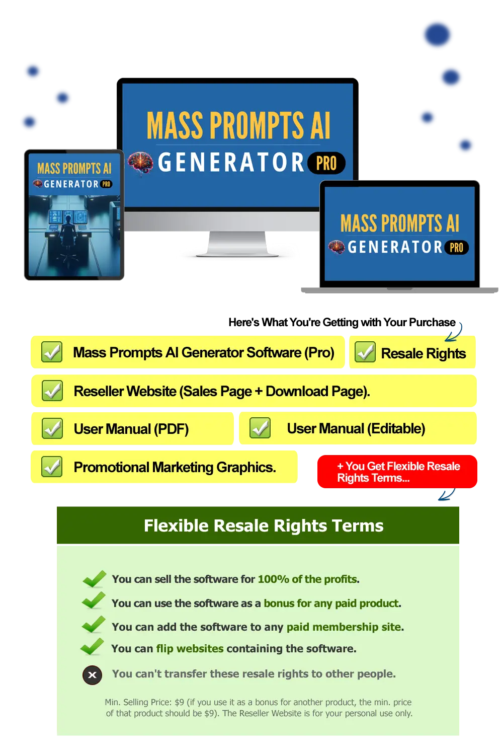 + You Get A Full "Done-For-You" Package To Start Selling The Mass Prompts AI Generator Software Right Away. See What's Included: